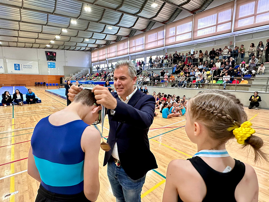 O vicepresidente da Deputación, Rafa Domínguez, fixo entrega de trofeos aos gañadores da categoría infantil da Copa Escolar de Ximnasia de Trampolín, que se celebrou hoxe no pavillón polideportivo do Centro Galego de Tecnificación Deportiva. No torneo, no que houbo categorías infantil, benxamín, cadete, xuvenil e absoluta, déronse cita preto de 650 deportistas de toda Galicia, que participaron nas categorías de doble minitramp, minitramp, tumbling e trampolín.
