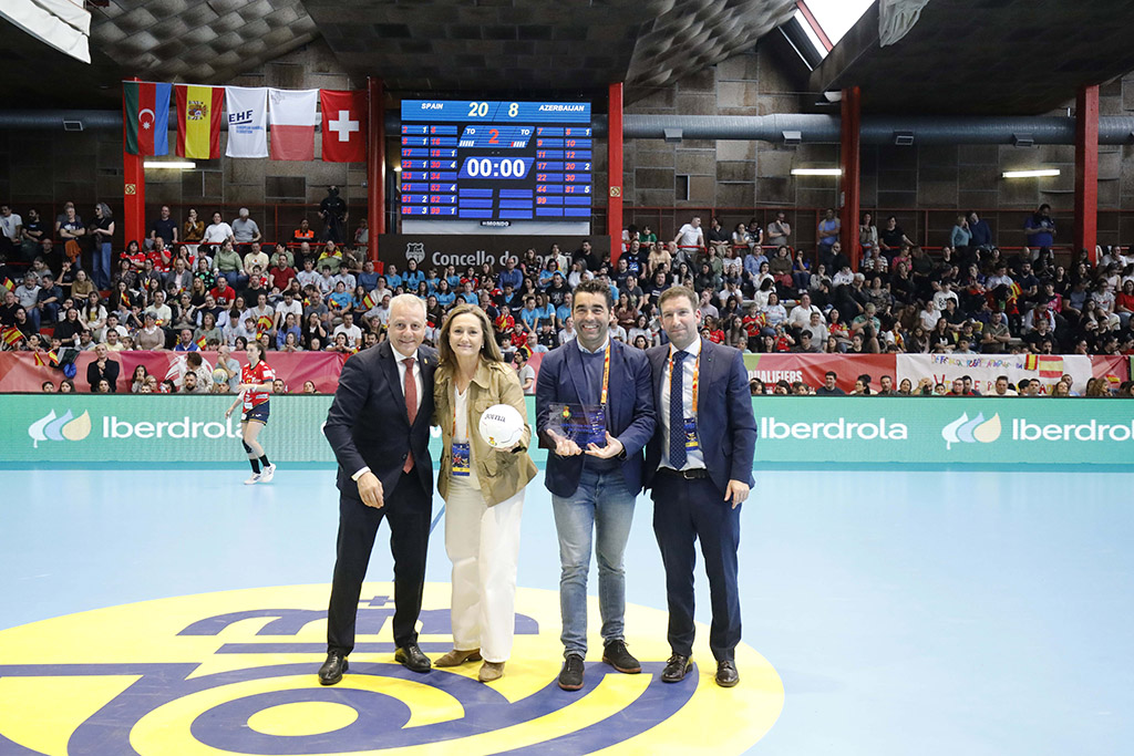 Luis López asiste ao partido entre as seleccións femininas de balonmán de España e Acerbaixán no Porriño, un dos grandes eventos deportivos promovidos pola Deputación