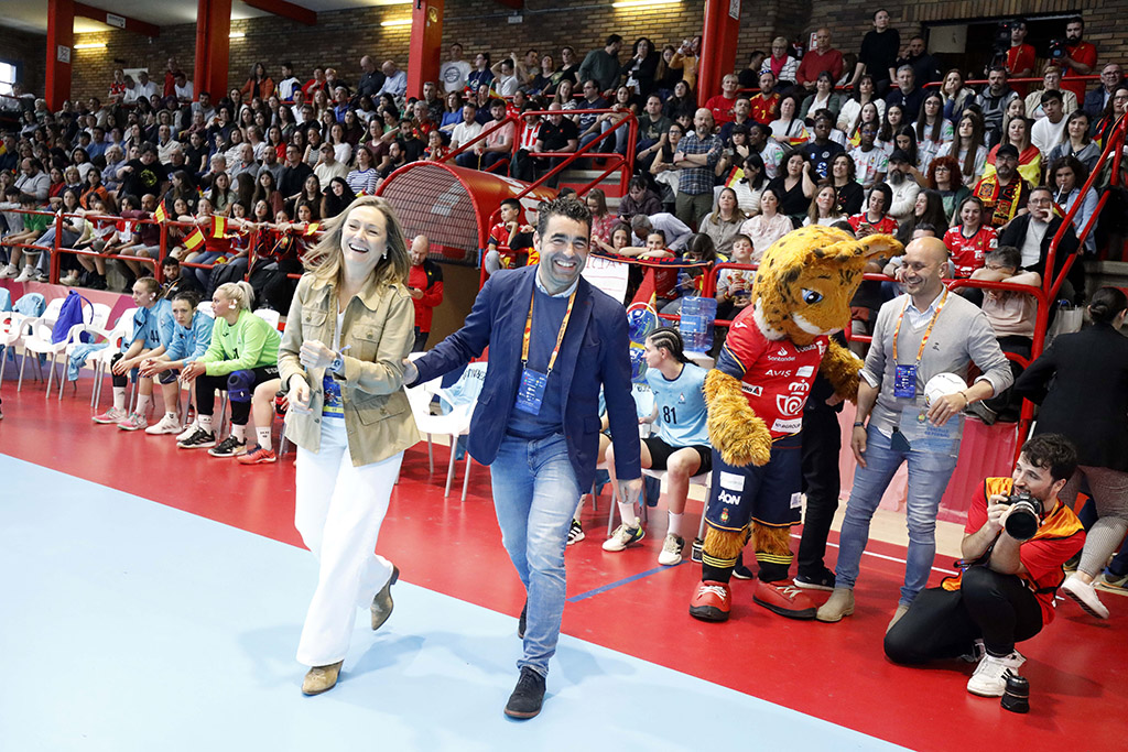 O presidente da Deputación de Pontevedra, Luis López, e a vicepresidenta, Luisa Sánchez, asistiron este domingo ao partido de clasificación para o Campionato de Europa 2024 de balonmán feminino que tivo lugar no pavillón municipal do Porriño entre as seleccións absolutas de España e Acerbaixán.