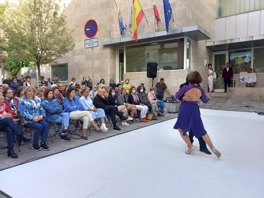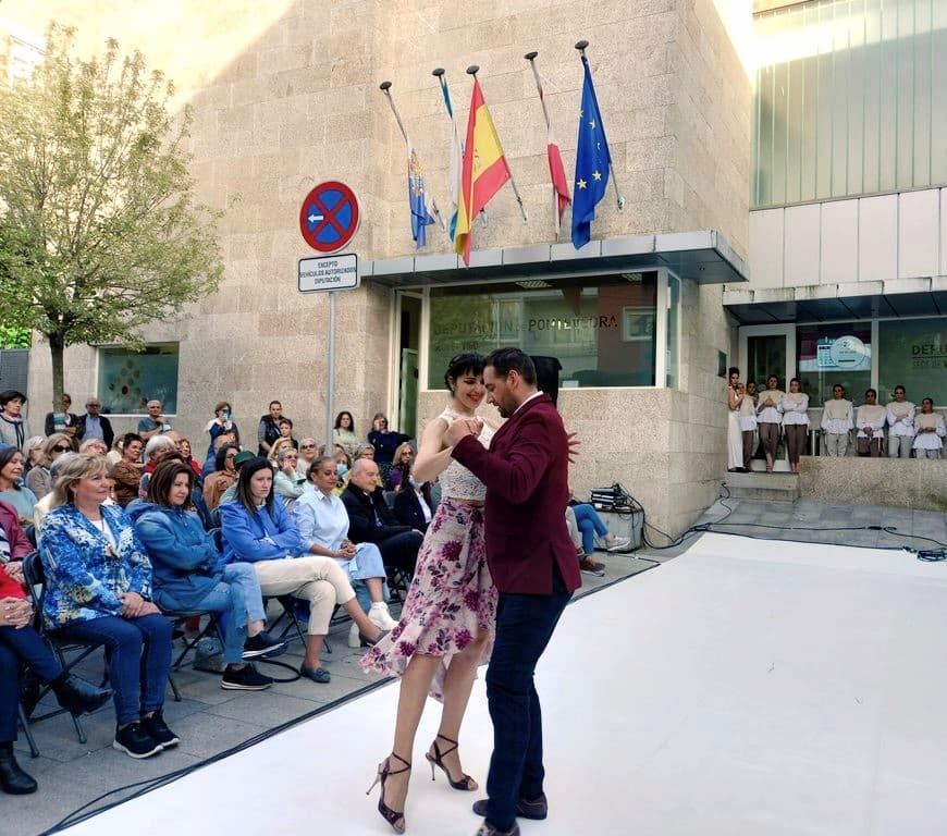A Deputación festexa este ano o Día Internacional da Danza con "Galicia - Arxentina: un baile de ida e volta", espectáculo organizado en colaboración co Consulado da República Arxentina, que esta tarde rendeu unha orixinal homenaxe ao tango na zona exterior da sede provincial en Vigo. O evento, que mostrou a fusión das culturas galega e arxentina, viaxará mañá sábado á cidade de Pontevedra e comezará ás 12.00 h, aberto ao público, na explanada exterior do Pazo Provincial.