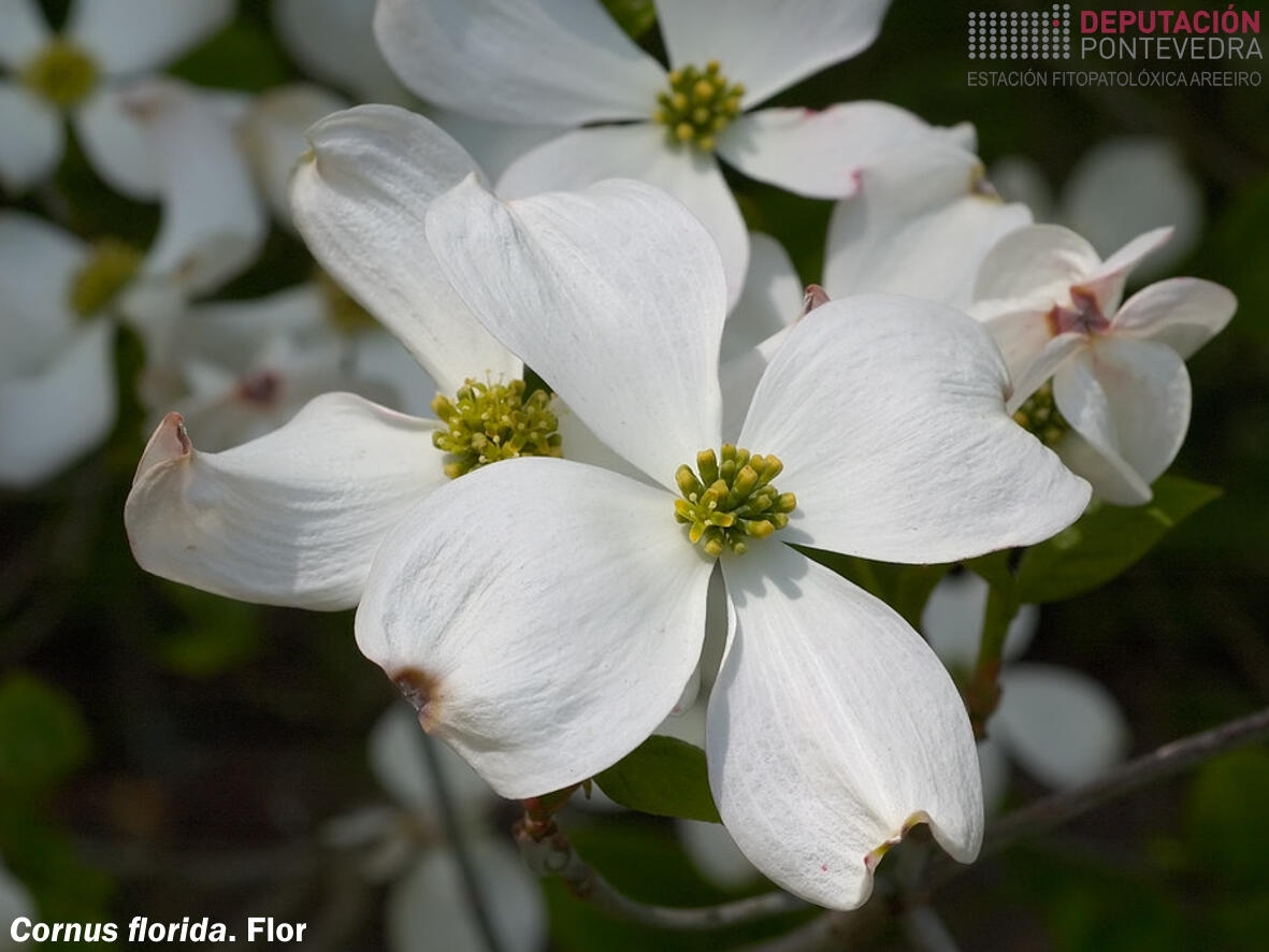 Flores: pequenas e agrúpanse en umbelas redondeadas moi densas. Están rodeadas por 4 brácteas de gran tamaño que parecen pétalos de cor branca, aínda que esta cambia segundo a variedade.