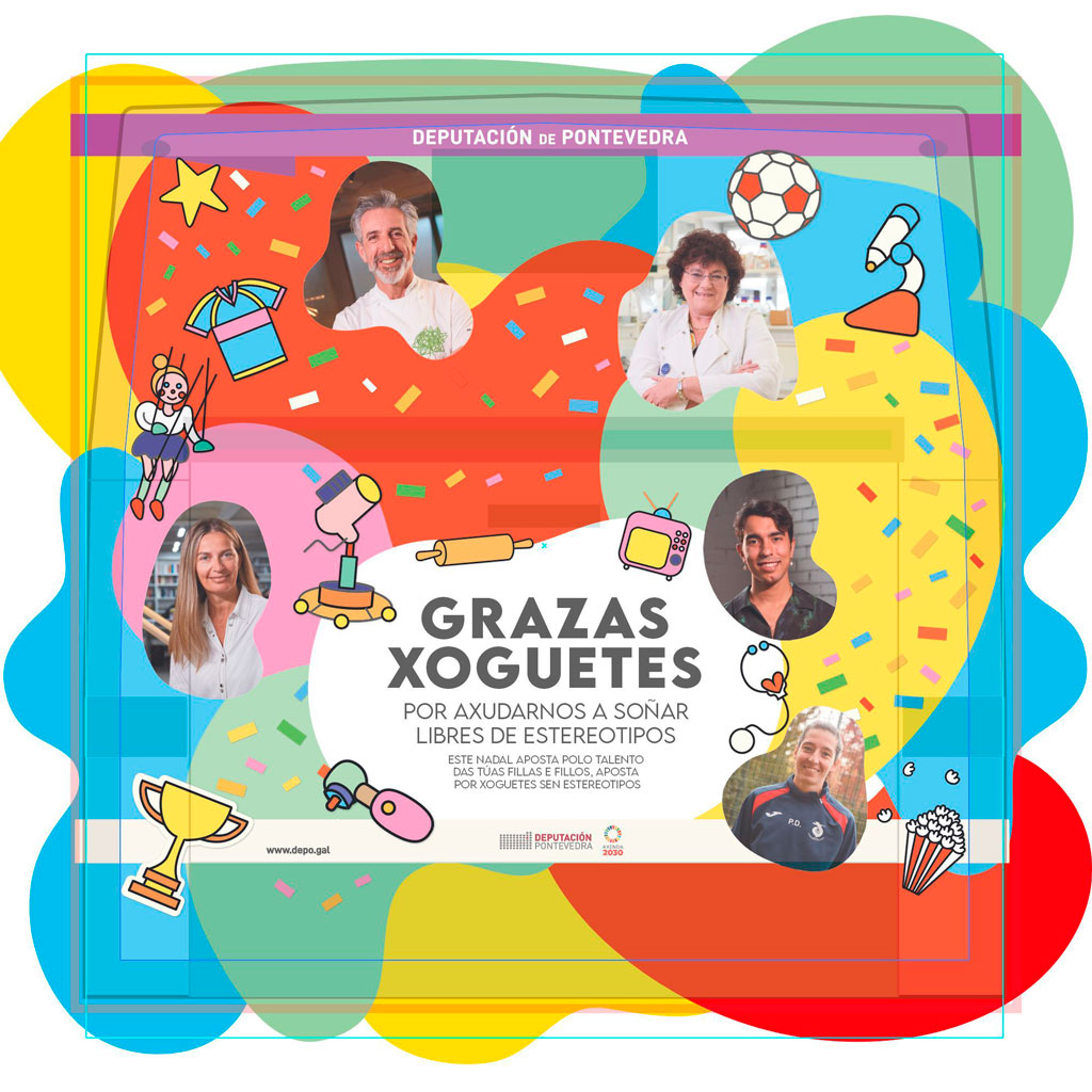 “Grazas xoguetes” reivindica deste xeito a importancia e o decisivo papel dos xogos e xoguetes na educación, no desenvolvemento da personalidade e na elección de futuras profesións. Xunto ás frases de cada protagonista figura un lema común: Este Nadal aposta polo talento das túas fillas e fillos, aposta por xoguetes libres de estereotipos. A campaña da institución provincial ten soportes físicos e virtuais, que inclúen amais da presenza nos Vitrasa, o vídeo colectivo e os individuais de cada protagonista, carteis e publicidade en medios. A iniciativa está dirixida á infancia, ás persoas encargadas de tomar a decisión de comprar un xoguete, como as familias, e tamén ao profesorado, Anpas, clubs deportivos e axentes culturais.