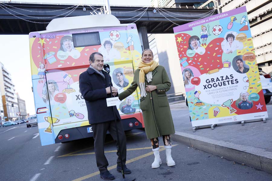 Desde hoxe mércores e ata o 6 de xaneiro, a campaña da Deputación para a adquisición de xogos e xoguetes igualitarios e non sexistas xa é visible nos autobuses de Vigo. A presidenta Carmela Silva, e o alcalde Abel Caballero presentaron a iniciativa “Grazas xoguetes” nun dos Vitrasa xa rotulado na parada da Laxe, no que destacaron o “impactante” da campaña, que “pretende crear conciencia na sociedade de que nenas e nenos teñen que xogar a todos os xogos e con todos os xoguetes sen que pensemos que uns están pechados para nenas ou para nenos”.