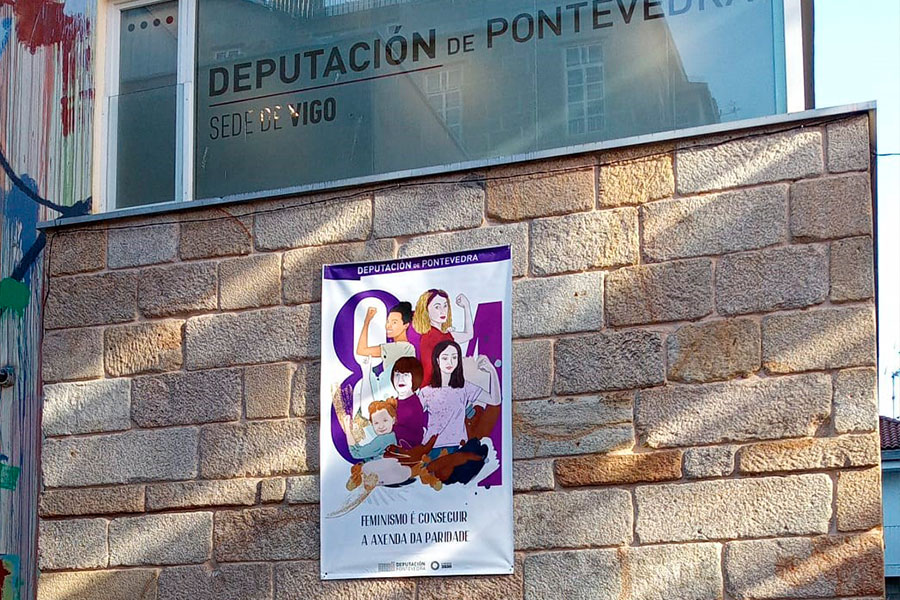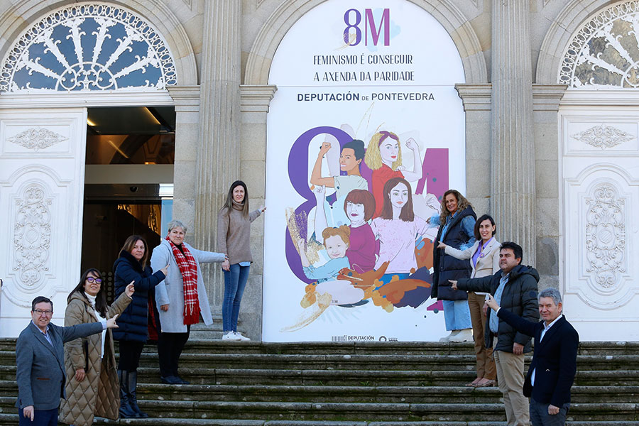 A porta central do Pazo provincial e a fachada da sede viguesa locen xa paneladas tamén coa “potente” imaxe da campaña do 8M, deseñada pola creativa Anabel Domínguez., na que xunto ao lema amósase a mulleres de distintas idades, desde nenas a maiores, desde unha posición “de fortaleza e empoderamento para loitar contra as discriminacións, sometementos e desigualdades que padecemos as mulleres e defendendo a axenda da paridade”. Carmela Silva lembrou que este é o eixo este ano, “porque temos avanzado moito nos últimos cen anos, pero seguimos infrarrrepresentadas en todos os eidos, na cultura, na empresa, na política, na ciencia...”. “E queremos dicir –engadiu a presidenta- que ata aquí chegamos, que nós esiximos ocupar a metade de todo. Iso significa que os homes teñen que renunciar aos seus privilexios para que nós poidamos ocupar o 50% de todas as actividades humanas. Quixemos que esta reivindicación estivera no centro do Pazo Provincial, ben visible para amosar cales son as nosas demandas”.