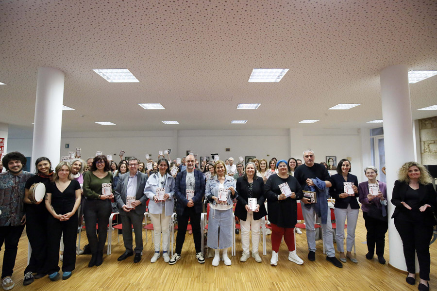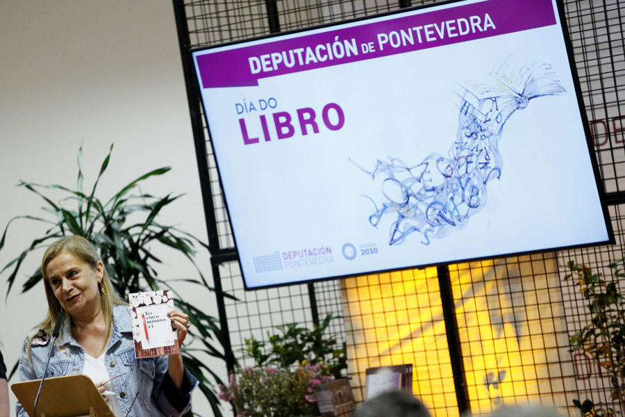 Cunha Sala Rosalía que volveu honrar o seu nome, chea de libros, camelias e persoas lectoras, a sede da Deputación en Vigo foi esta tarde o epicentro da cultura coa celebración do Día Internacional do Libro, unha emotiva homenaxe á escrita galega e a posta en valor da inesgotable canteira de autoras e autores que atesoura. Deste xeito, o acto acolleu a presentación de Tes cinco minutos #3, o terceiro volume que sae das mans do alumnado da Escola de Letras promovida pola institución provincial e a Editorial Galaxia, coa intervención de varios e varias participantes que leron os seus textos, acompañados da música tradicional do trío Abril, formado por Marina Carpente ao violín, Claudia Abril á voz e pandeireta e Antón Lago á guitarra clásica, que interpretou a Xota de Parada de Achas, o Valse e xota de Barro de Arén, o Pasodobre Bembrive e a Muiñeira de Caroi. Amais, o claustro da actual edición da Escola e as dez autoras galegas que participaron na obra Ti non sabes o que é ser escritora, xurdido ao abeiro do Manifesto de Soutomaior, tamén puxeron voz a textos literarios nos dous audiovisuais que se proxectaron.