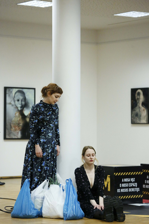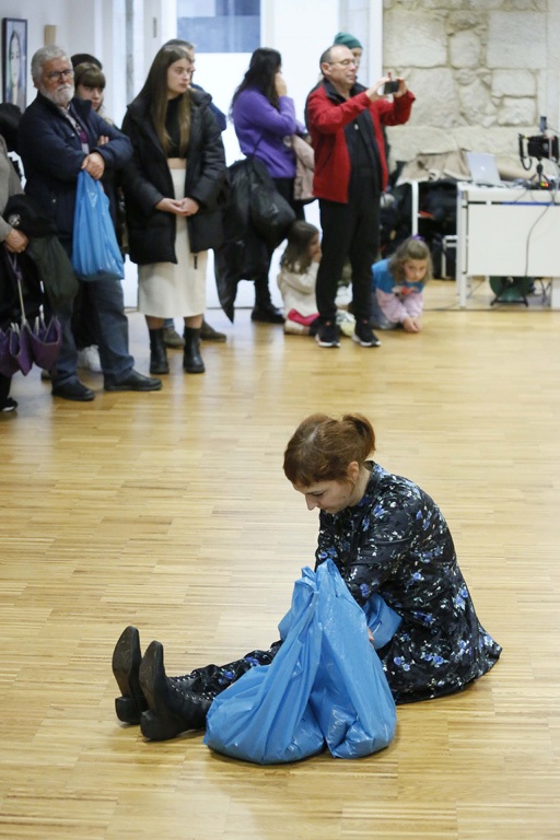 Neste mesmo espazo viviuse en directo o remate da acción do 8M protagonizada por Andrea Mosquera e María Roja. As dúas creadoras terminaron alí o percorrido iniciado desde o Xulgado de Violencia sobre a Muller reclamando a implicación do público asistente para acadar “o relevo dese peso que levan as mulleres” e que elas simbolizaron cargadas coas bolsas da compra. “Isto é algo que abrangue a toda a sociedade e ese peso témolo que levar entre todos e todas”, afirmou Mosquera. “Nese percorrido –indicaron as artistas- tentas coller aire. Para nós, o alento do título é por unha parte ese intento de sobrevivir ao esforzo, pero tamén é o alento de todas. Nós levamos un peso físico, pero para outras mulleres ese peso non está materializado”.