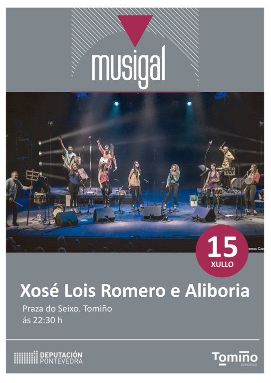 E en Tomiño actuarán Xosé Lois Romero & Aliboria na praza do Seixo ás 22.30 horas coa posta en escena do seu proxecto de vangarda e respecto pola tradición. Trátase dun espectáculo baseado única e exclusivamente en voces e percusións tradicionais, con dez músicos sobre o escenario que recuperan elementos tradicionais que se empregaban en Galicia a principios e mediados do século XX (instrumentos para labrar o campo, utensilios de cociña, latas de pemento) xunto a outros instrumentos clásicos da música tradicional galega. Acompáñalles un coro de seis cantareiras que conectan a tradición coa música tribal de África ou a América Latina. A agrupación leva nos escenarios dende hai máis de 5 anos, teñen tocado xa en grandes festivais como Ortigueira ou o Intercéltico do Morrazo e os seus membros comparten xiras con distintas bandas como Baiuca ou Vetusta Morla.