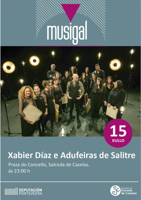 Pola súa banda, Xabier Díaz & Adufeiras de Salitre ofrecerán a súa actuación ás 23.00 horas na praza do Concello de Salceda de Caselas. O seu espectáculo céntrase no seu terceiro álbum conxunto, As Catedrais Silenciadas, que culmina un proceso que comezou no ano 2015 no que o elemento diferencial son o conxunto de mulleres vocalistas e percusionistas. As composicións de Díaz, en moitos casos, parten do traballo de investigación, escoitando as cancións das mulleres no rural, e dándolles o seu toque particular. O citado traballo actualiza diferentes tipos de formas musicais, como pasodobres, xotas, alalás, ribeiranas ou muiñeiras, e foi galardoado co Premio Martín Codax na categoría de Música Tradicional no 2020. Díaz atesoura unha traxectoria de case 40 anos, sempre coa música pop(ular) no horizonte, amais dunha incesante actividade docente, en asociacións e certames. Formou parte de Berrogüetto entre 2008 e 2014 e, paralelamente, participou xunto a Guadi Galego, Xosé Lois Romero e Guillerme Fernández no proxecto aCadaCantos.