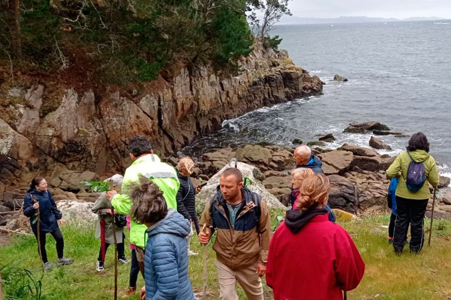 Sempre coas pautas da camiñada en silencio, a desconexión dos móbiles e a respiración profunda para desfrutar do momento e sentirse parte da experiencia, Sergio Portela e Siegrun Bischof guiaron o percorrido por esta illa, que abrangue unha extensión total de 28 hectáreas e acada unha altitude de 80 metros no alto de San Facundo. No que atinxe á vexetación, o espazo acusa unha forte presenza de eucalipto e acacia, pero aínda así é un lugar especial para encontrarse con elementos naturais fermosos, como é o caso da praia Area Grande e o seu sistema de dunas, “que son preciosos de sentir”. Tamén destacan os taffonis e o patrimonio construído é abundante e inclúe o faro, restos dun lazareto e un albergue, un polvorín e os peiraos.
