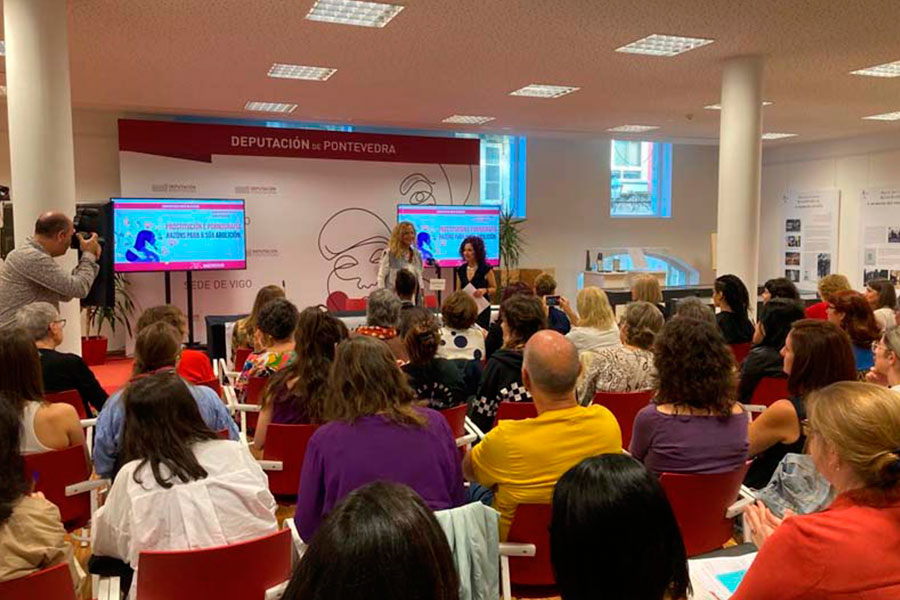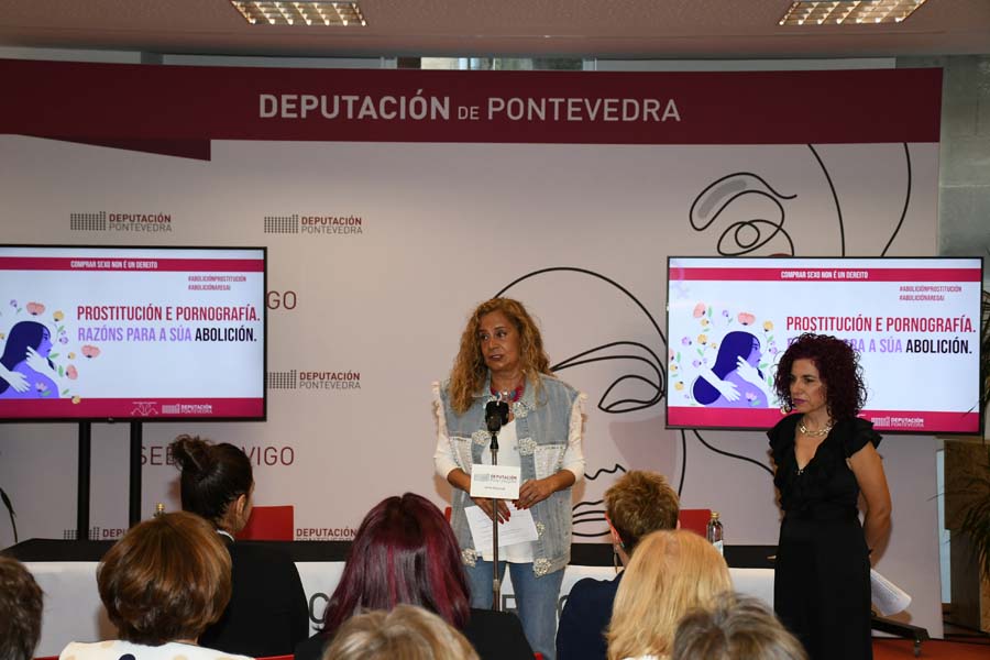 Ante un auditorio ateigado que encheu por completo a sala Rosalía de Castro da sede viguesa da Deputación e cun rotundo mensaxe abolicionista, a presidenta Carmela Silva deu o tiro de saída a xornada “Prostitución e pronografía. Razóns para a súa abolición” organizada este sábado pola Rede Galega pola Igualdade en sesións de mañá e tarde. Mulleres “moi potentes” do feminismo, profesoras universitarias, políticas e activistas da talla de Eva Ventín, Rosa Cobo, Amelia Tiganus, Layla Abdelkader, Helga Pita e Noa Díaz déronse cita no “acto máis importante que hoxe se está a celebrar en toda Galicia” -tal e como o cualificou Carmela Silva- para reflexionar sobre a lacra da prostitución e pornografía e reclamar a aprobación da Lei de Abolición da Prostitución.