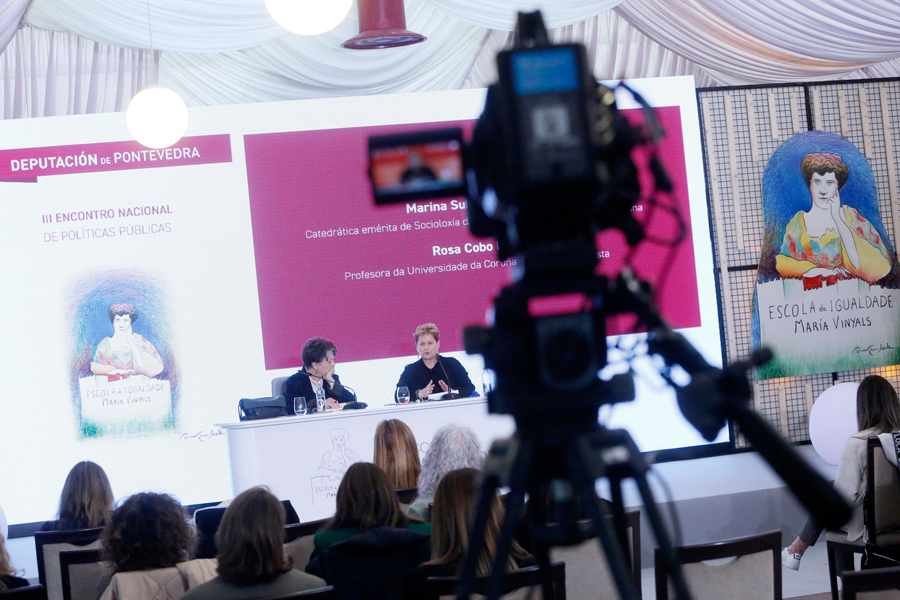 Tras dous días de debate nos que participaron 14 mulleres profesionais de eidos como a política (desde o nivel estatal ata o autonómico, provincial e municipal), os medios de comunicación e a xustiza, o Castelo de Soutomaior acolleu este xoves a segunda e última sesión do III Encontro Nacional de Políticas Públicas organizado pola Deputación de Pontevedra ao abeiro da Escola de Igualdade María Vinyals. A coordinadora do encontro, Rosa Cobo, e a socióloga Marina Subirats ofreceron as conclusións das xornadas, ás que asistiu a presidenta Carmela Silva e nas que tamén se abordaron cuestións da axenda feminista de máxima actualidade como son as agresións sexuais, o machismo na pornografía e os ventres de alugueiro. As xornadas tamén se puideron seguir por streaming, onde o conxunto das retransmisións en Twitter e YouTube foron seguidas por máis de 2.000 persoas entre o mércores e o xoves.