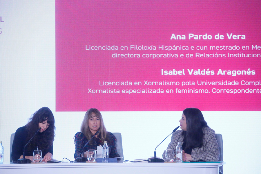 A xornalista Guada Guerra coordinou a mesa sobre medios de comunicación na que interviron a directora corporativa e de Relacións Institucionais de Público, Ana Pardo de Vera, e a correspondente de xénero de El País, Isabel Valdés Aragonés. Ana Pardo de Vera defendeu que “as mulleres fan un traballo moi importante e nunca recoñecido nas cúpulas directivas”, un teito “aínda non roto xa que só un 20% están nos equipos directivos e nos grandes grupos os consellos de administración seguen sendo un campo de nabos”. Por iso asegurou que “nunha situación de privilexio temos o deber de ir abrindo camiño como sexa” e apelou ás “políticas públicas, porque os protocolos non abondan”.