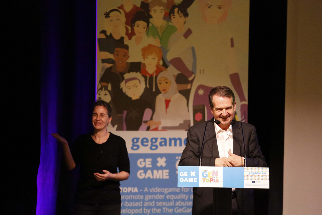 Durante a presentación do videoxogo, Priscila Retamozo, coordinadora do programa Canteira de Igualdade da Deputación, impartiu a conferencia “A igualdade, un asunto no que xogamos moitos”, na que fixo un repaso por algunhas situacións e estereotipos que se dan en coñecidos videoxogos, nos que “a desigualdade pasa do mundo físico ao virtual”. Nese sentido, Gentopía é “un avance, unha maneira de que entendades de que isto non é unha guerra de xéneros, non é ‘chicos contra chicas’”, polo que retou ás e aos estudantes a “sumarse a un futuro mellor ou quedarvos quedos e no pasado”. “Esta batalla gañarémola os que queremos camiñar cara o futuro, porque somos moitas e moitos, porque cada vez hai máis chicos que se suman ao cambio”, polo que os animou a “poñer as gafas violetas para que poidades ver con visión crítica certas cuestións, ver se esta realidade ten sentido ou se hai que cambiala, e Gentopía é a oportunidade de elixir quen queredes ser, sexades chicos e chicas”.