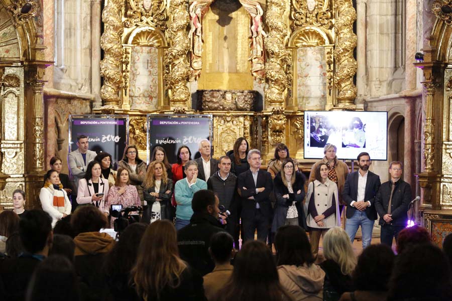 Coa música de Cora Velasco, a acústica de Santa Clara, e  nun acto coral cos concellos da provincia e colectivos de mulleres, da cultura e da sociedade, a Deputación de Pontevedra vén de arrancar “Fronte ao negacionismo. Alianzas dende o feminismo” a ampla programación da institución provincial para conmemorar o 25 de Novembro, Día Internacional da Eliminación da Violencia contra a Muller. Carmela Silva foi tallante: “este ano, no que de novo volvemos a escoitar mensaxes negacionistas que afirman que non hai violencia contra as mulleres polo feito de selo, imos traballar a carón de catro grandes alianzas fundamentais, dende a comunicación, a educación, a cultura e a investigación, para transformar a sociedade, este mundo patriarcal, machista, que nos discrimina e violenta”. A presidenta estivo acompañada dos alcaldes de Pontevedra, O Grove, Poio e Tui, e de concelleiras e concelleiros de concellos como A Lama, Ribadumia, Silleda, Mos e Vilagarcía, así como de representantes de CIMs e integrantes da policía local, de asociacións de igualdade e do tecido social, educativo e cultural da provincia. No acto, no que tamén se proxectou o vídeo resumo da sétima edición de “Mulleres en acción. Violencia Zero”, escoitouse, a través da montaxe sonora “Voz colectiva”, as reivindicacións das mulleres artistas protagonistas da nova edición, centradas no poder transformador da arte para avanzar na igualdade e na loita contra as violencias machistas.