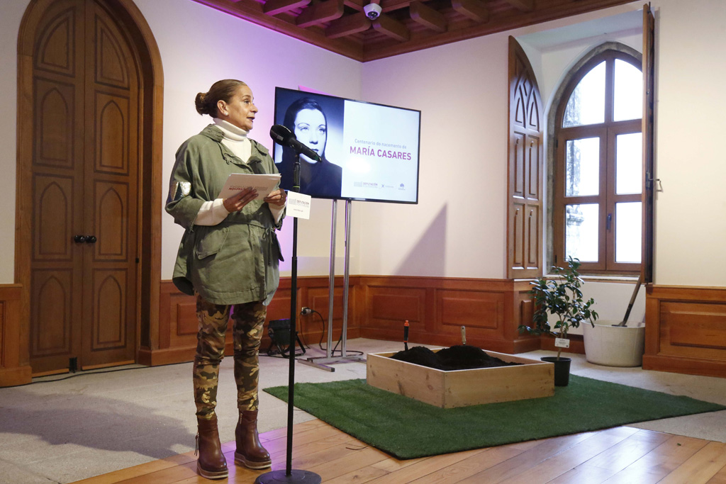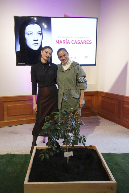 Debido ao mal tempo, a homenaxe desenvolveuse no Salón do Tapiz do Castelo, onde xunto á presidenta provincial, Carmen Salinero, xefa do Servizo de Areeiro, e María Casares-Paula Sanmartín plantaron a camelia nunha caixa de madeira para proceder nos vindeiros días ao seu traslado ao xardín. Carmela Silva puxo en valor a necesidade de reivindicar o legado de María Casares no seu centenario e destacou que “foi unha muller libre, independente, transgresora, adiantada ao seu tempo de enorme personalidade e voz inigualable”. “Pero nesta provincia queremos reivindicar –engadiu a presidenta provincial- a súa arte, a extraordinaria calidade dunha actriz única, a súa vida, a súa valentía e o seu compromiso cun mundo novo que non temos logrado construír, no que a metade da poboación, exactamente o 51%, ocupemos o noso espazo e onde se faga visibles ás grandes mulleres que tanto aportaron á humanidade. María Casares foi un delas. Foi unha gran muller á que admiramos, queremos e rendemos homenaxe porque se merece todos”.