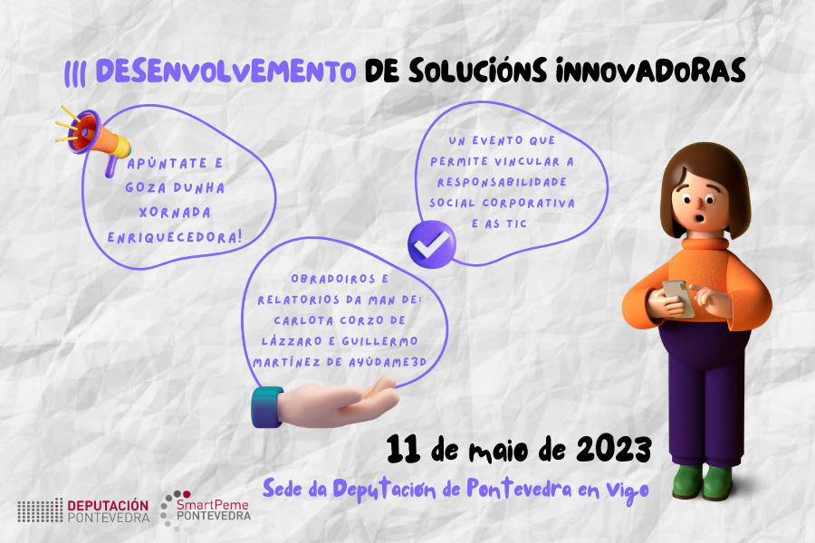 Involucrar ao tecido empresarial da provincia no compromiso social e fomentar este tipo de emprendemento é o obxectivo da terceira acción do programa de Desenvolvemento de Solucións Innovadoras que promove Smartpeme e que terá lugar o vindeiro 11 de maio na sede da Deputación en Vigo. Trátase dunha xornada para impulsar o talento da provincia que incluirá diversas actividades, como os relatorios de Carlota Corzo e Guillermo Martínez, así como obradoiros e sesións de networking, nas que as e os participantes poderán tomar parte na creación de solucións innovadoras enmarcadas na Responsabilidade Social Corporativa (RSC). Pódese xa formalizar a inscrición no programa, que permanecerá aberta nesta ligazón ata o 8 de maio.