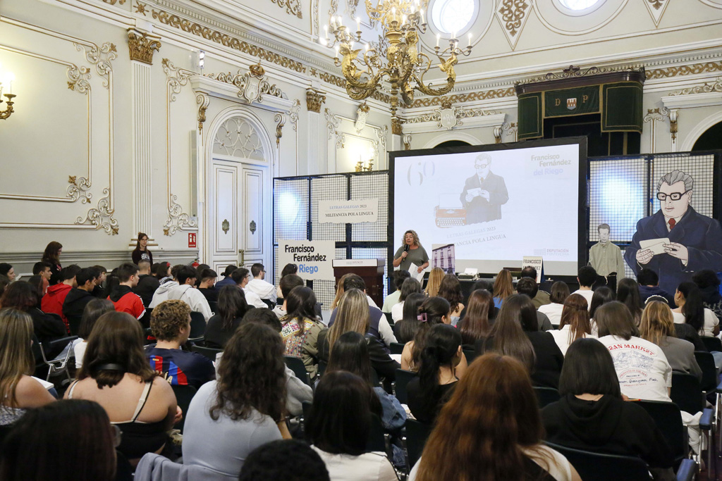 O Pazo Provincial da Deputación acolleu hoxe un dos seus actos centrais para celebrar as Letras Galegas 2023 en homenaxe ao seu creador, Francisco Fernández del Riego, cun espectáculo teatral destinado á mocidade ao que asistiu alumnado dos centros integrados de formación profesional Carlos Oroza e Manuel Antonio e dos institutos Valle Inclán e Frei Martín Sarmiento.