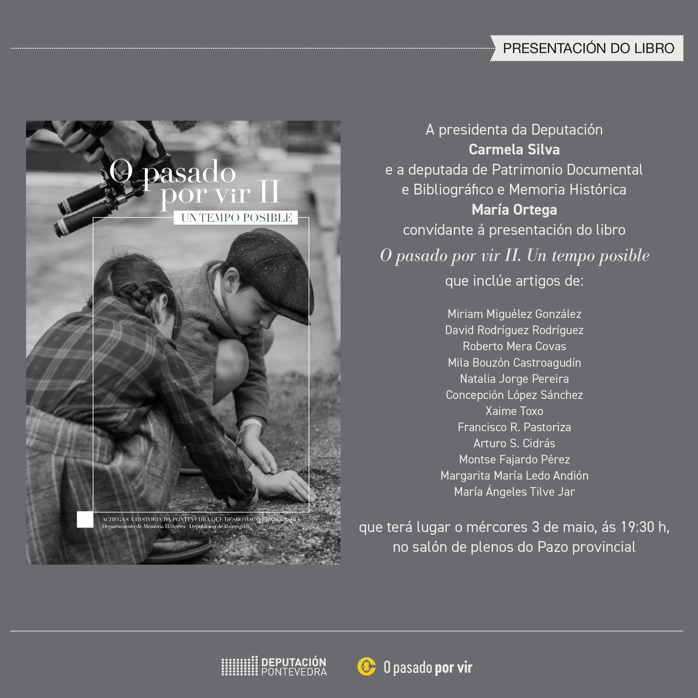A Deputación de Pontevedra, a través do seu departamento de Memoria Histórica, vai presentar mañá o libro ‘O Pasado Por Vir II. Un Tempo Posible’, unha nova publicación que recolle proxectos de progreso desenvolvidos na Galiza de principios do século XX, pero truncados polo golpe do 1936. O acto, que será no Pazo Provincial ás 19.30 horas, contará coa participación de Xaime Toxo e Margarita Ledo e a actuación musical de MJ Pérez.