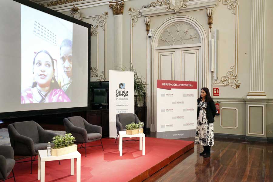 A delegada da Fundación Vicente Ferrer, María Moldes, explicou pola súa banda que o proxecto ‘Maana Bhoomi’ permitiu a 34 familias na India –coas que se fixo unha conexión por zoom- dispoñer de vivendas dignas escrituradas a nome das mulleres, o que cambiou o seu rol na sociedade, e pretende desenvolver e mellorar iniciativas de compostaxe.