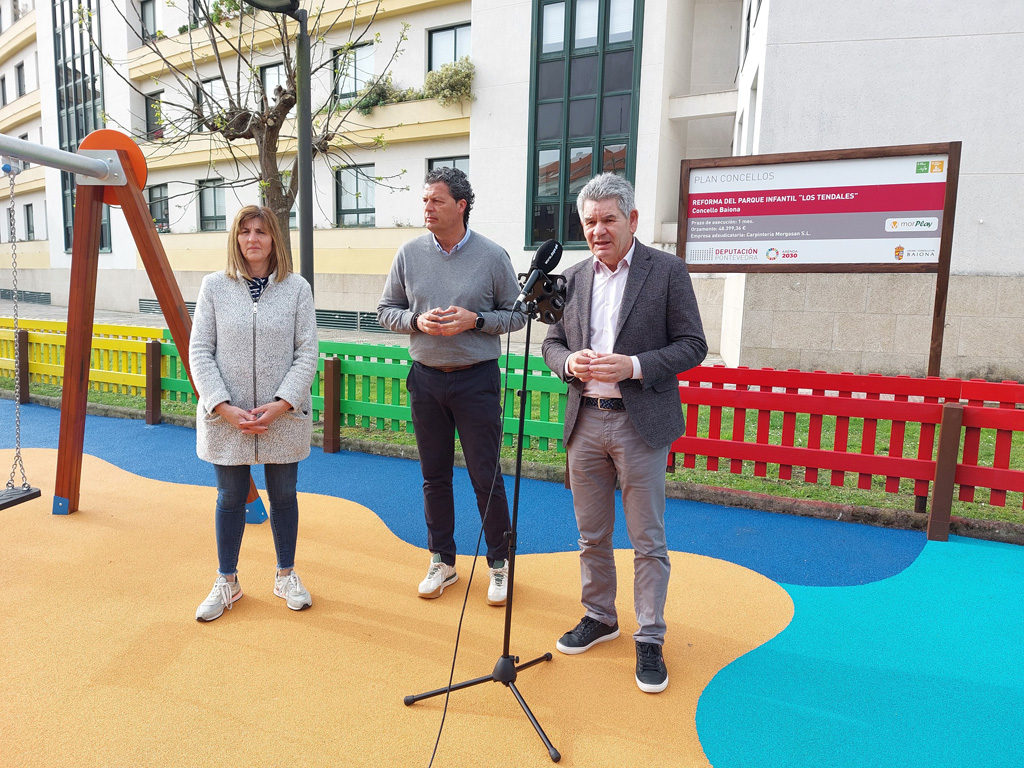 O Concello de Baiona vén de acometer a reforma integral do céntrico Parque Infantil Os Tendais coa substitución dos xogos existentes, a renovación do pavimento de caucho e a mellora da accesibilidade deste espazo ao abeiro do Plan Concellos da Deputación. O deputado de Cooperación, Santos Héctor Rodríguez, e o alcalde Carlos Gómez inauguraron hoxe os traballos realizados na área infantil, que contaron cunha achega provincial de ao redor de 50.000 euros, e que permitiron, como subliñaron, modernizar e adecuar esta contorna ás necesidades de seguridade para as crianzas.