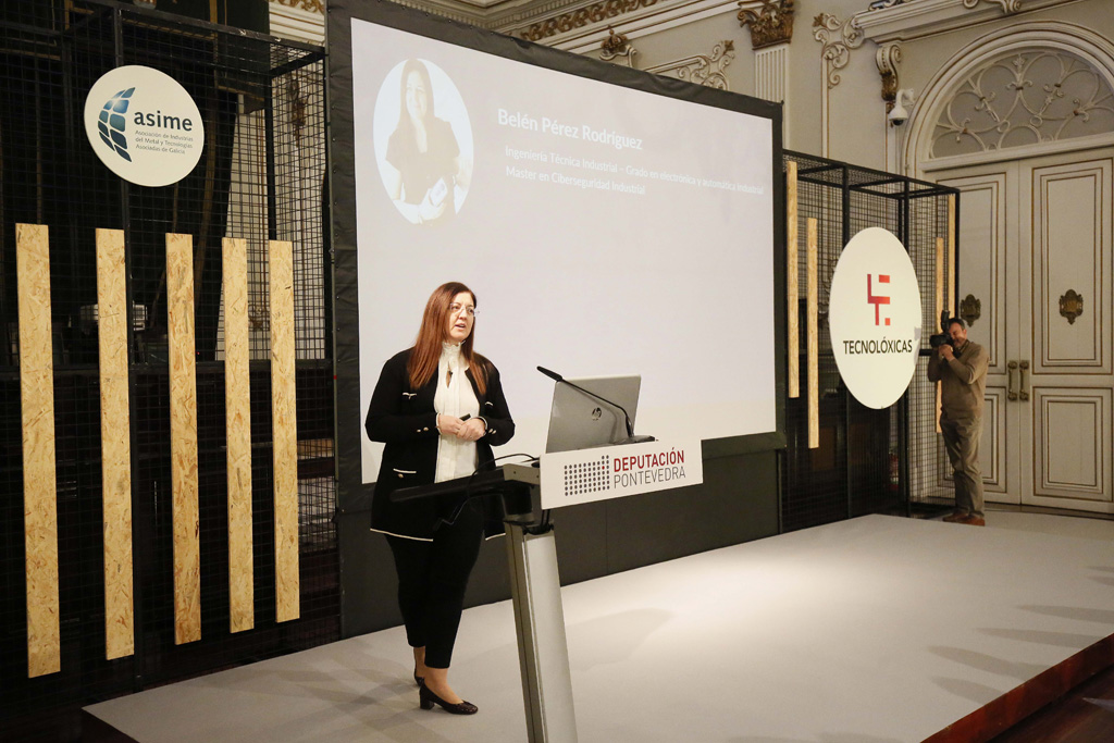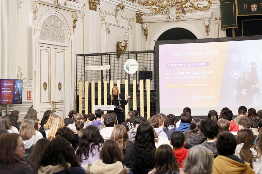 En pleno ecuador da “Tecnolóxicas Week”, o Salón de Plenos do Pazo provincial encheuse hoxe coa nova actividade impulsada pola Deputación de Pontevedra e ASIME para fomentar as vocacións técnicas entre a xente nova, con especial fincapé nas nenas e rapazas dada a fenda de xénero existente tanto no sector profesional como nos estudos da rama. Máis de 150 alumnas e alumnos dos institutos Valle Inclán e Sánchez Cantón de Pontevedra asistiron á charla sobre ciberseguridade impartida por Belén Pérez, CISO (Chief Information Security Officer) de Nueva Pescanova e coordinadora en Galicia do CCI (Industrial Cybersecurity Center). A presidenta, Carmela Silva, asistiu a esta acción que forma parte dos 10 eventos programados ata o venres en concellos das 10 comarcas da provincia, xusto antes do Día Internacional da Muller e da Nena na Ciencia que se celebra este mesmo sábado.