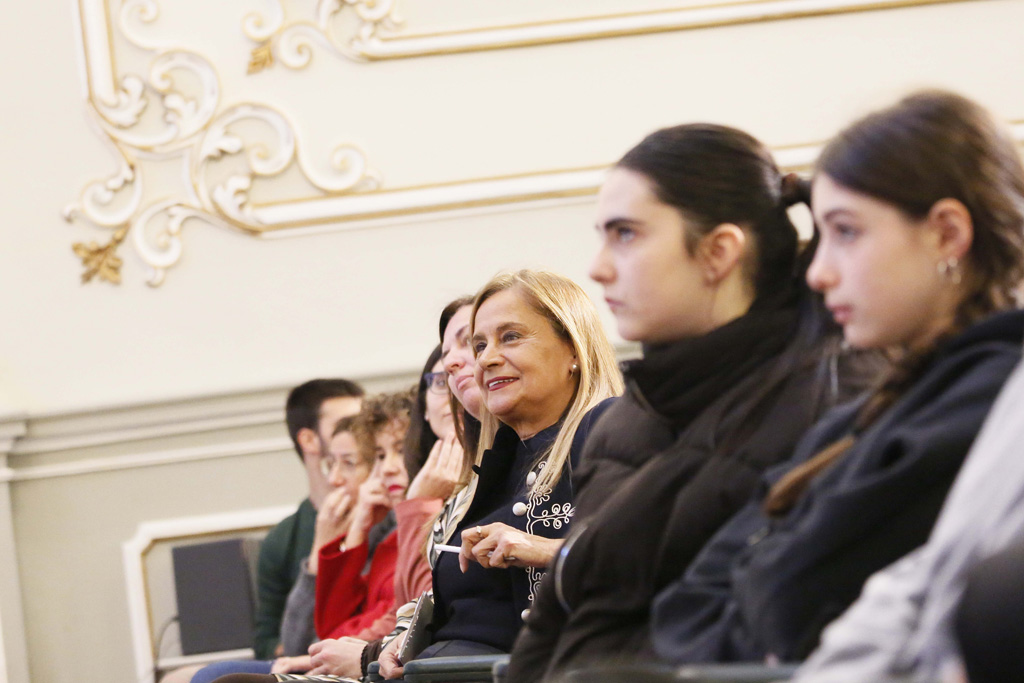 Carmela Silva asistiu á actividade impartida pola xefa de ciberseguridade de Nueva Pescanova, Belén Pérez, cunha masiva presenza do alumnado dos IES Valle Inclán e Sánchez Cantón de Pontevedra