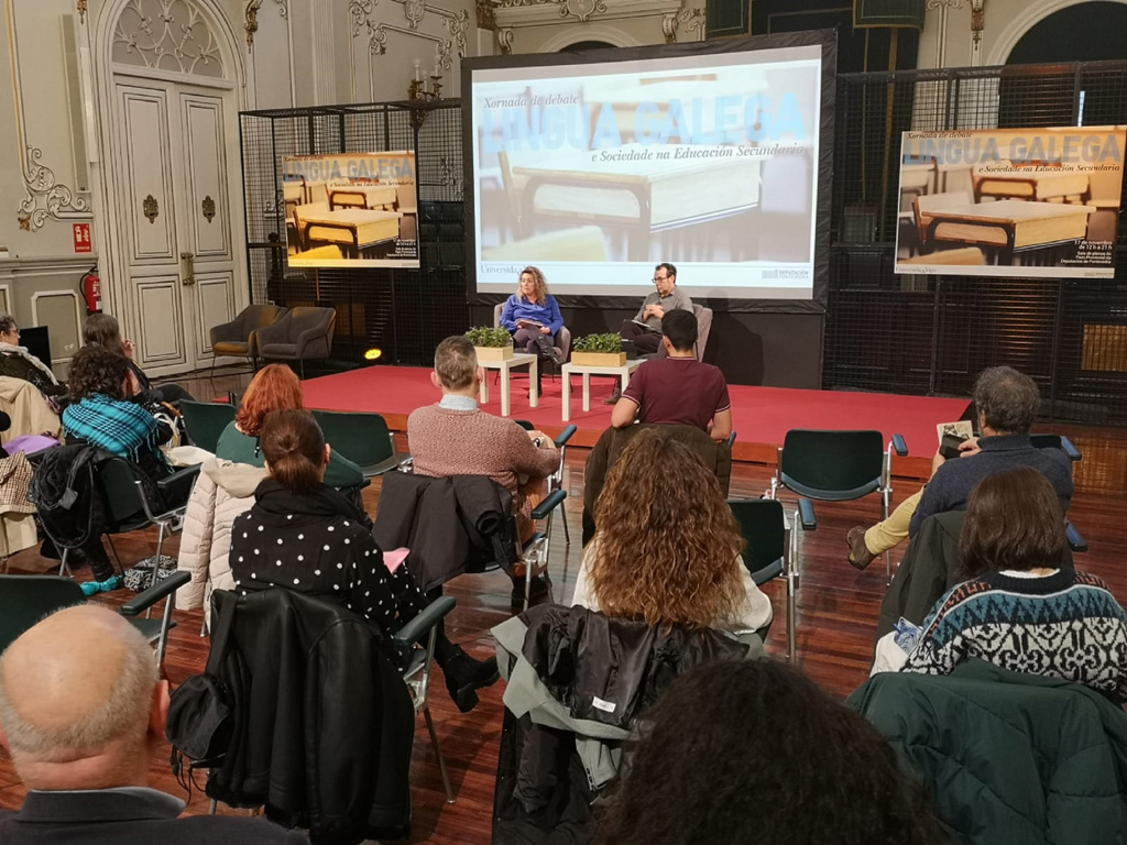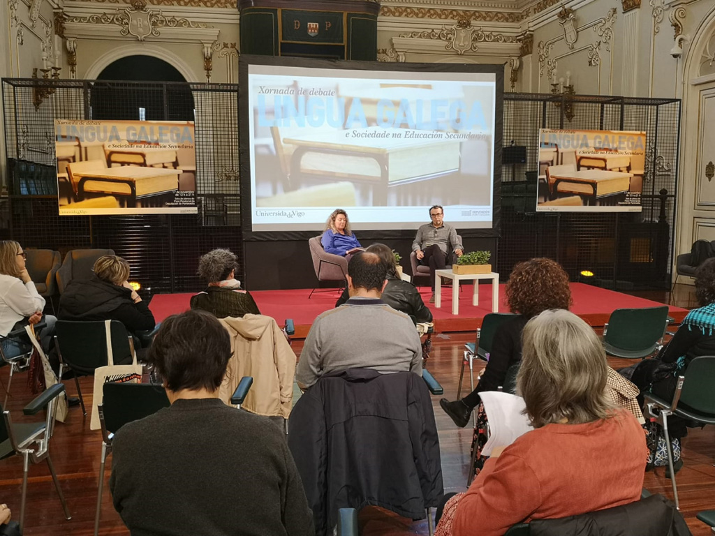 Como xornada de peche deste proxecto, o Pazo Provincial acolle este xoves un encontro dirixido a “profundar no coñecemento crítico e dialéctico da relación entre lingua e sociedade en Galicia, poñendo o foco no fortalecemento da lingua galega no sistema educativo”. Estruturada en catro bloques, esta xornada arrancou cunha primeira mesa centrada en analizar “as focaxes sociolingüísticas dominantes na docencia e investigación universitarias”. Moderada por Ramallo, esta primeira mesa contou coas intervencións das profesoras da Universidade de Santiago de Compostela Bieito Silva e María López Sández e do director do Departamento de Filoloxía Galega e Latina da UVigo, Xosé Henrique Costas. “Nós contribuímos á formación do que profesorado de secundaria. Isto é un bucle e tamén ter que haber cambios na universidade”, salientou Ramallo.