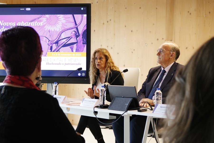 Os novos aparatos ideolóxicos do patriarcado son desde hoxe protagonistas da cuarta edición do workshop “Sociedade dixital e xénero. Hackeando o patriarcado” que están a impulsar a Deputación de Pontevedra e a Universidade de Vigo ao abeiro da Cátedra de Feminismos 4.0. A presidenta Carmela Silva e o reitor Manuel Reigosa, xunto á directora da área de Igualdade da UVigo, Águeda Gómez, deron o tiro de saída a este encontro virtual e presencial para reflexionar sobre o patriarcado dixital que conta con conferenciantes da talla de Remedios Zafra, Mónica Alario, Elisa García, Elena Alfageme, MªTeresa Piñeiro e Alba Alonso. A xornada rematará mañá, 3 de novembro, con “Reescribe o código. Obradoiro de educación en ciberactivismo feminismo” que, con todas as prazas esgotadas, terá lugar entre as 17.00 e as 19.30 na Facultade de Comercio de Vigo.
