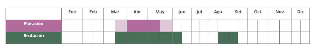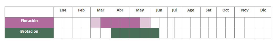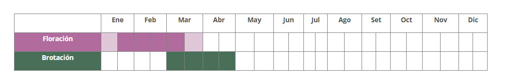 - Floración: tardía, comienza a principios de marzo y finaliza en mayo