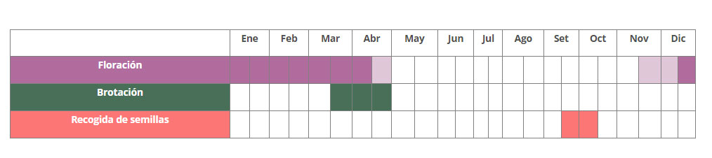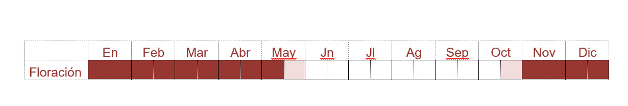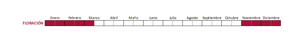 - Floración: media estación, comienza entre noviembre y diciembre y se extiende hasta mayo; plena floración desde diciembre hasta abril