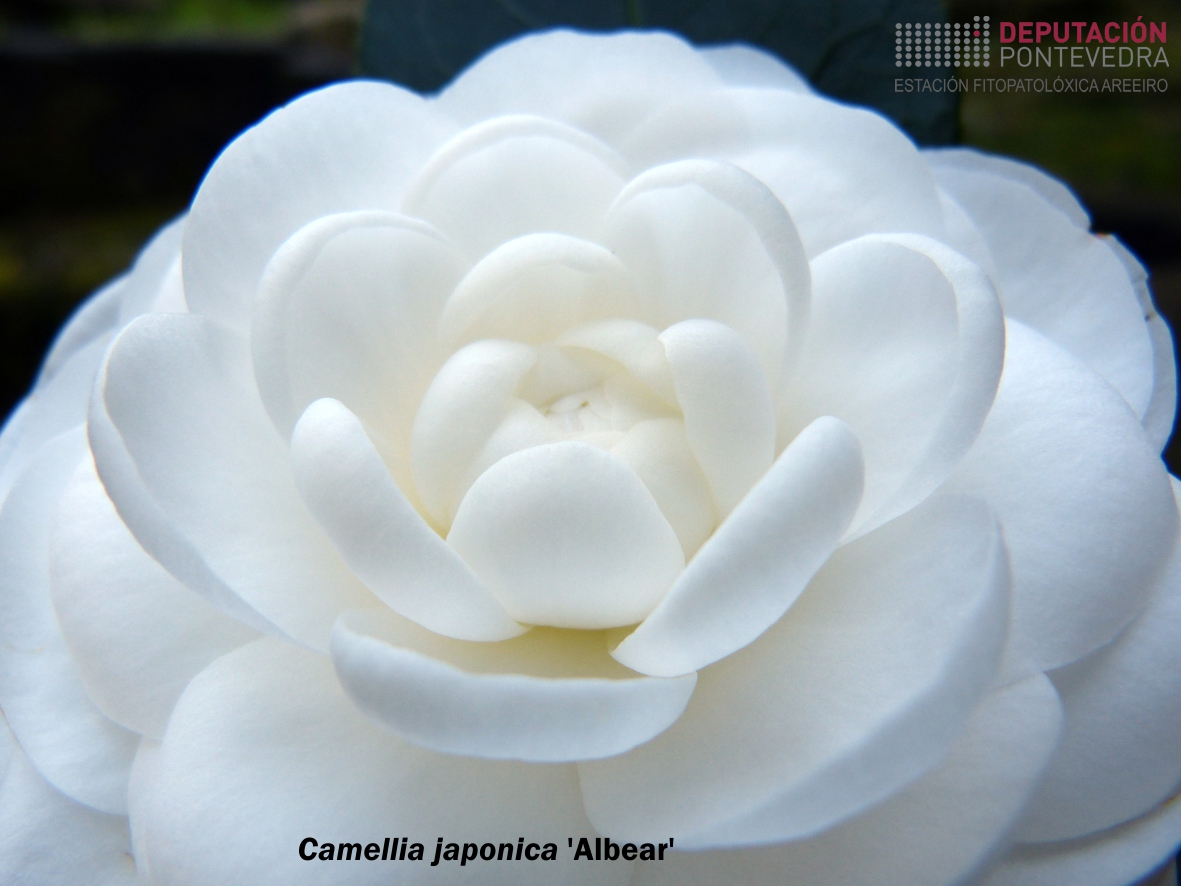 Flor: de tamaño mediano (8 cm de diámetro) y blanco puro, doble superposición formal, con pétalos redondeados y cóncavos
