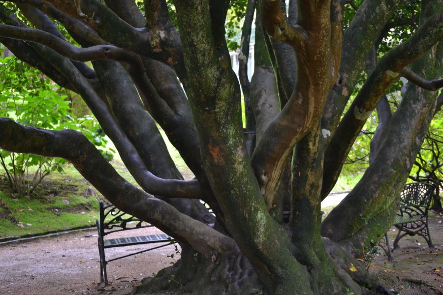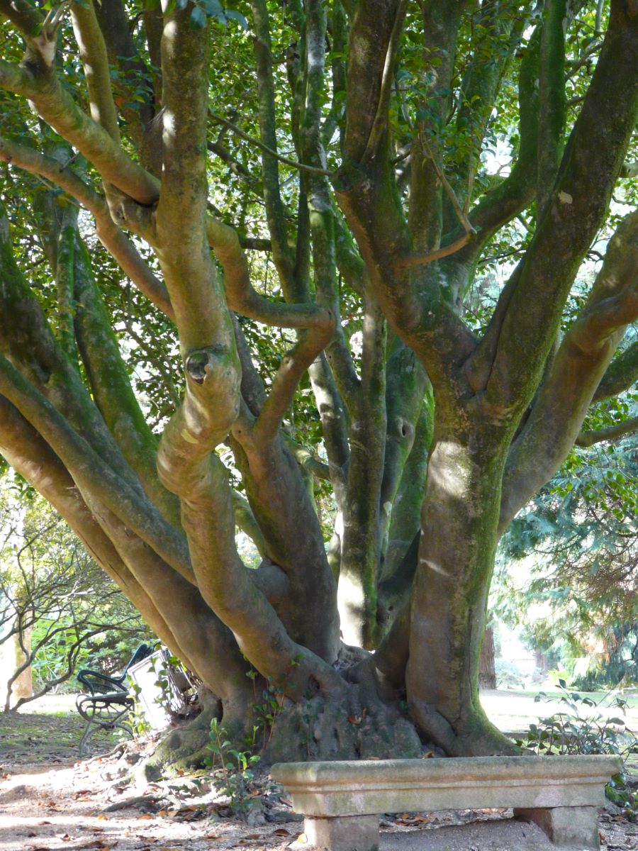 Destaca un ejemplar con la circunferencia de tronco más grande de Galicia. Desde su amplia base (5,22 m de perímetro) surgen dieciocho gruesos troncos y su redondeada copa, también de grandes dimensiones (17 m). Las flores son dobles con forma de rosa, de color blanco jaspeado de rosa o rosa en su totalidad.