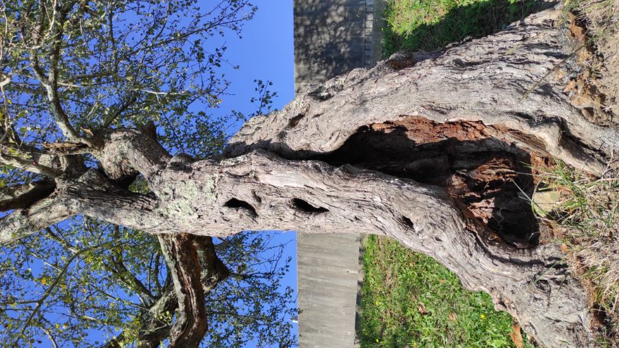 En una de las cuestas que bajan desde el Espazo Fortaleza hasta la playa de Goián podemos contemplar este espectacular espino. Su tronco, que crece inclinado hacia el talud, muestra numerosas cavidades en las que se pueden apreciar setas. A dos metros de altura se divide en cuatro ramas de grandes dimensiones, que, tras sucesivas ramificaciones, forman la amplia copa, de forma semiesférica. Durante los meses de primavera esta aparece completamente cubierta de pequeñas flores de color blanco que hacen aún más espectacular lo que puede ser el ejemplar gallego de mayor envergadura de esta especie.