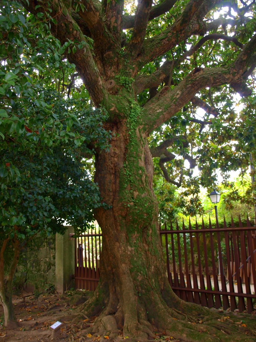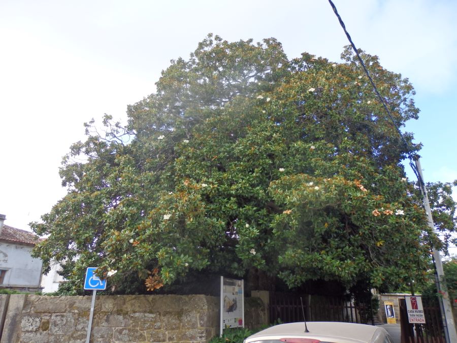 El monumental magnolio crece en la parte geométrica del jardín primitivo, del siglo XIX, del pazo de O Cuadrante, acompañado por setos de boj (Buxus sempervirens), un tejo (Taxus baccata), una michelia (Magnolia figo), un árbol de Júpiter (Lagerstroemia indica) y cuatro ejemplares de camelia (Camellia japonica).