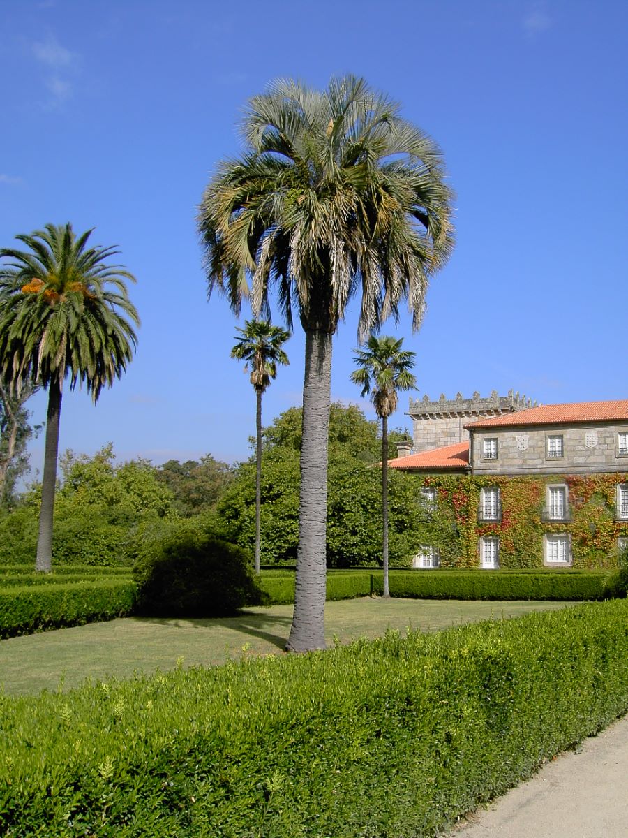 En el pazo de Castrelos (Vigo), con jardines creados probablemente por una firma portuguesa de jardinería hacia 1890, se encuentra la mejor colección de palmeras monumentales de Galicia, aunque ninguna de ellas está catalogada como árbol singular. En el recinto encontramos varios ejemplares que superan el siglo de existencia, como la butia (Butia odorata), la livistona (Livistona australis), las palmeras canarias (Phoenix canariensis), la palmera de Senegal (Phoenix reclinata) o los falsos palmitos (Trachycarpus fortunei), acompañadas de algunas de plantación más reciente, como las palmeras datileras (Phoenix dactylifera), la palmera de la reina (Syagrus romanzoffiana), la palmera alexandra o real australiana (Archontophoenix alexandrae), la kentia (Howea forsteriana), la palmera datilera enana (Phoenix roebelenii), la palmera de abanico mexicana (Washingtonia robusta) y su híbrido con la palmera de abanico californiana (W. filifera), de nombre científico Washingtonia x filibusta.