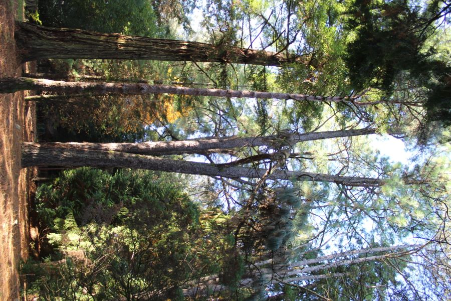 El pino de hoja larga del vivero central de Areas responde al modelo de “árbol pantalones”; tiene un tronco de grandes dimensiones que a 1,60 m de altura sobre el suelo se bifurca en dos potentes brazos, que configuran un porte atractivo y vistoso, con copa con forma de parasol, aunque no muy frondosa. A pesar de su edad, próxima a un siglo, muestra un buen estado de conservación y disfruta de buena salud.