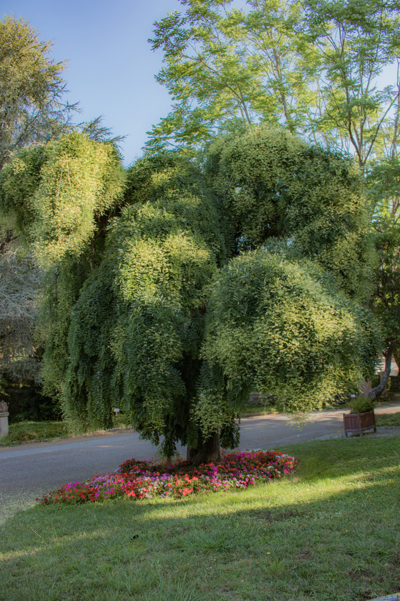 En el lateral derecho del pazo, donde comienza la subida hacia el viejo invernadero modernista, se encuentra el magnífico ejemplar péndulo de la sófora. Aunque está rodeado de otras especies de gran tamaño, todas ellas mantienen la distancia por las carreteras y parterres que hay alrededor de él.