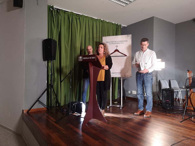 Ao día seguinte será a quenda da homenaxe institucional no Concello de Bueu ás seis e media da tarde na Casa do Pobo de Beluso, parroquia onde naceu Millán. Alí presentarase de novo a ‘Obra Poética Completa’ a cargo de Manuel Rei, e participarán a deputada María Ortega e o alcalde Félix Juncal. A nota musical poraa a agrupación Xardín Desordenado, que musicará varios dos poemas de Millán Otero.