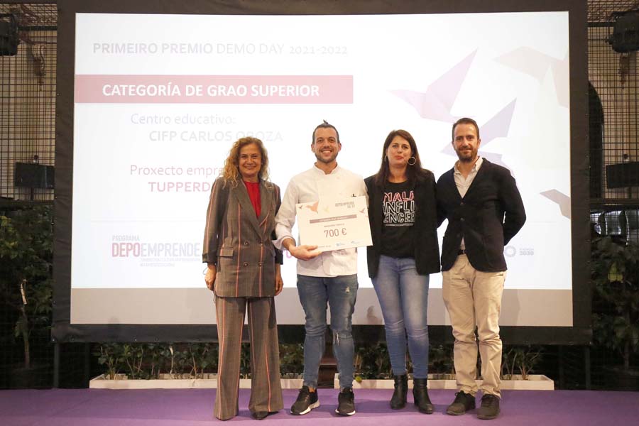 A iniciativa “Pastelería consciente” do CEIFP Carlos Oroza (Pontevedra) alzouse como gañadora da categoría de grao medio, que conta cun único premio de 700 euros. Esta proposta está centrada na alimentación consciente, saudable e con produtos galegos. Os premios para os proxectos de grao superior recaeron en “Tupperdición” do CEIFP Carlos Oroza (Pontevedra) -primeiro premio dotado de 700 euros- e “Optimus” do IES Rodeira (Cangas) -segundo premio con 500 euros-. A primeira delas trátase dun servizo de entrega a domicilio de comidas saudables en tuppers reutilizables. Pola súa banda, “Optimus” ofrece un script que optimiza o rendemento de Windows en equipos obsoletos ampliando a súa vida útil e maximizando o valor dos PC.