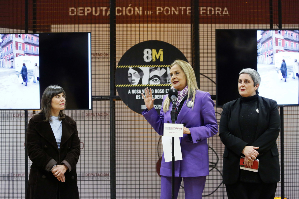 Dúas mulleres camiñan cargadas de bolsas da compra polas rúas de Vigo amosando o peso que levan nas súas costas todas as mulleres pero os seus gritos de auxilio non son escoitados. Outras dúas mulleres amosan mentres tanto a súa memoria e a súa loita pola igualdade a través das imaxes, esculturas e instalacións nas salas que levan o nome doutras pioneiras, Rosalía de Castro e Maruja Mallo. As catro creadoras, Andrea Mosquera, María Roja, Puri Díaz e Ofelia Cardo protagonizaron hoxe as accións artísticas coas que a Deputación “alenta” a loita pola igualdade neste 8M en Vigo. “Temos dereitos, temos voz e reclamamos o noso espazo. Hoxe vivimos a maxia que xera o feminismo nun acto de berro, cultura e sororidade”, destacou a presidenta provincial Carmela Silva.
