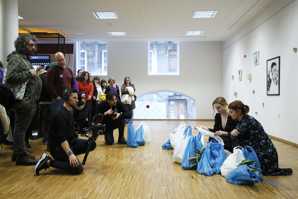 Neste mesmo espazo viviuse en directo o remate da acción do 8M protagonizada por Andrea Mosquera e María Roja. As dúas creadoras terminaron alí o percorrido iniciado desde o Xulgado de Violencia sobre a Muller reclamando a implicación do público asistente para acadar “o relevo dese peso que levan as mulleres” e que elas simbolizaron cargadas coas bolsas da compra. “Isto é algo que abrangue a toda a sociedade e ese peso témolo que levar entre todos e todas”, afirmou Mosquera. “Nese percorrido –indicaron as artistas- tentas coller aire. Para nós, o alento do título é por unha parte ese intento de sobrevivir ao esforzo, pero tamén é o alento de todas. Nós levamos un peso físico, pero para outras mulleres ese peso non está materializado”.