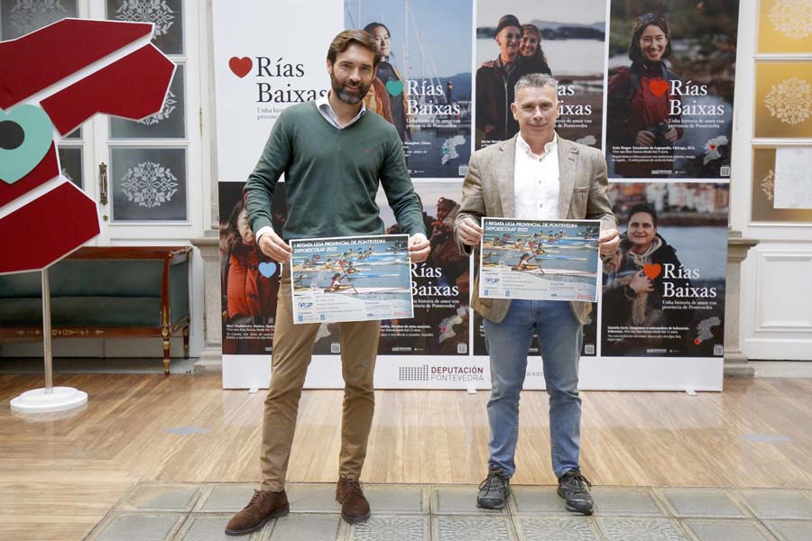 O deputado de Deportes, Gorka Gómez, e o presidente da Federación Provincial de Piragüismo, Alfredo Bea, presentaron a I Regata da Liga Provincial de Pontevedra DepoEscolas 2022, na que as/os 450 nenas/os que se forman deportivamente gracias a esta iniciativa da Deputación, competirán mañá no encoro de Verducido entre as 10.00 ás 13.30 horas nas categorías de prebenxamín, benxamín e alevín (entre os 6 e os 12 anos).
