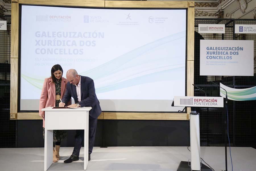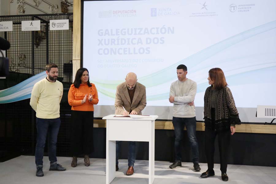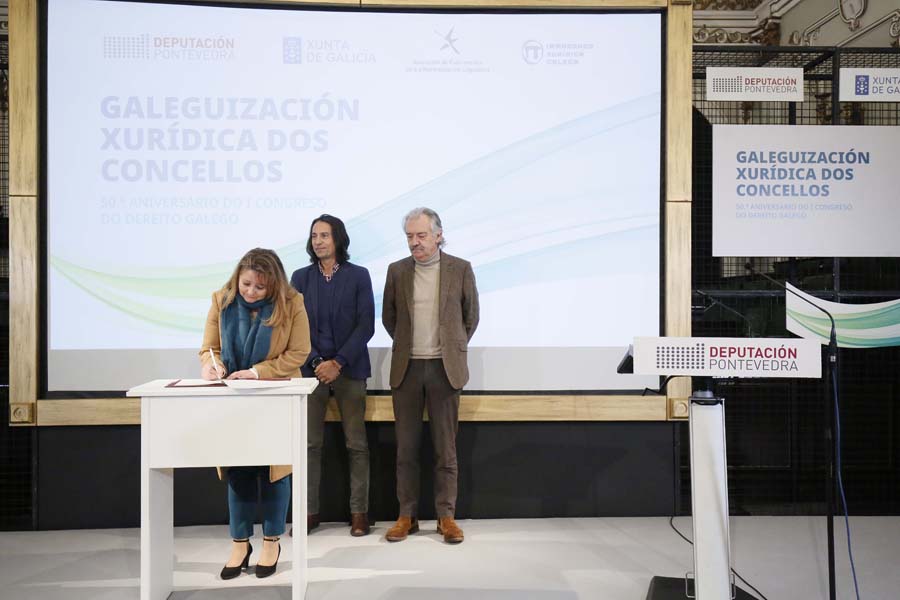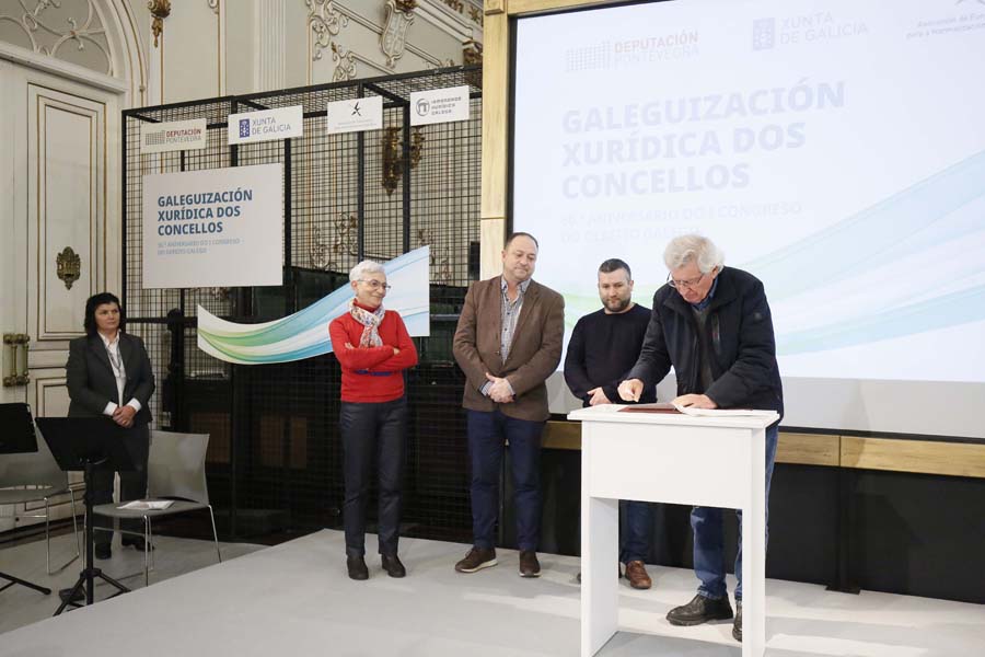 A Deputación de Pontevedra, a Irmandade Xurídica Galega e a Xunta de Galicia, xunto a 35 pequenos concellos da provincia, asinaron hoxe a ‘Declaración de Pontevedra’, un manifesto no que se comprometeron a fomentar o uso do galego nas relacións entre as corporacións locais e a xustiza. Segundo subliñaron a presidenta Carmela Silva e a deputada de Lingua María Ortega, este compromiso supón “un feito histórico” na normalización do idioma do país, xa que nestes momentos a lingua galega fica aínda relegada no uso xudicial por cuestións históricas.