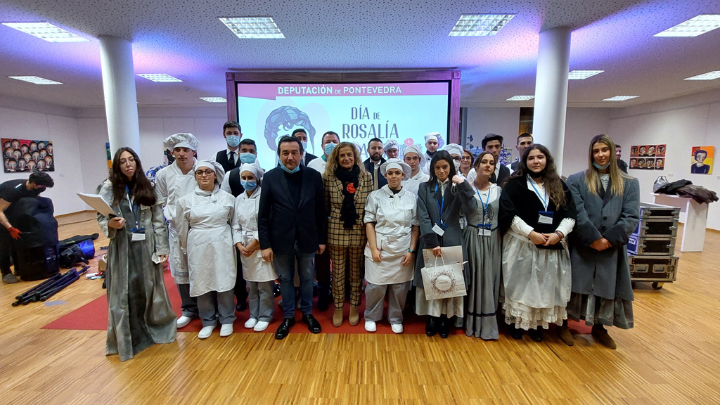 Non podería ter un escenario máis acaído a homenaxe a Rosalía de Castro promovida pola Deputación na sede de Vigo para honrala polo seu día grande. A sala dedicada á autora de Padrón, que leva o seu nome, mesturou esta tarde moitos dos ingredientes que identifican á escritora para preparar un acto con sabor “a gloria”. Así, co caldo así descrito na súa obra Follas Novas e recuperado da man do alumnado do CIFP Manuel Antonio, coa poesía cantada e bailada polos e polas escolares que participaron no certame da Deputación, e lembrada a través do Manifesto da Asociación de Escritoras e Escritores en Lingua Galega (AELG), o evento que encheu a Sala Rosalía vestiuse coa camelia que leva o seu nome e escoitou o son estelar de Ialma, o grupo de pandeireteiras belgas netas de migrantes galegas. Todo para subliñar, como dixo a presidenta Carmela Silva, que “Rosalía provoca alegría, orgullo, que nos poñamos de pé e nos sintamos grandes e fortes. Con ela celebramos a nosa cultura, o noso pobo e celebramos ás mulleres galegas que coma ela son esa luz que nos alumea e que nos fai sentir orgullosas e orgullosos”.