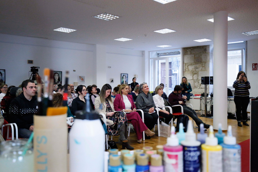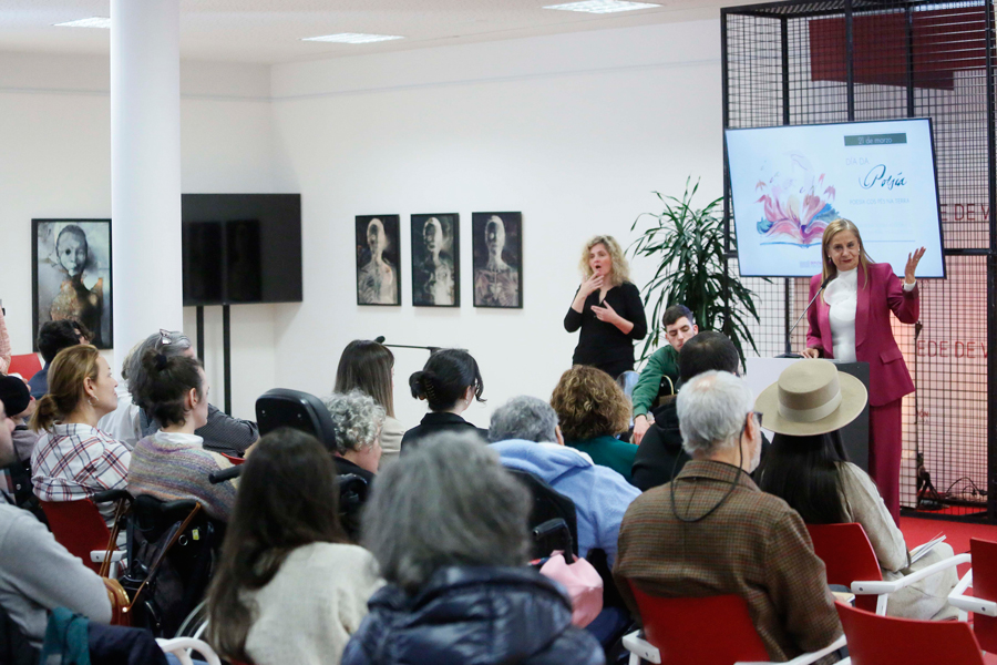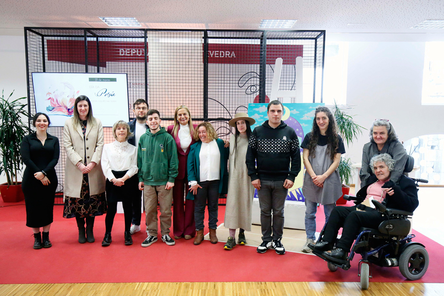 A primavera chegou á provincia con poesía, diversidade, música, ilustración e, por enriba de todo, bágoas e risos cargados de emoción, de respecto, de inclusión e de accesibilidade para todas as persoas. A Deputación celebrou por todo o alto o Día Internacional da Poesía cunha espectacular e emocionante acción, na sala Rosalía da sede de Vigo, que conmemorou a “Poesía cos pés na terra!” cun fermoso recitado poético no que participaron tres voces novas pero xa consolidadas do panorama lírico galego, Ana Fontenla, Ismael Ramos e Andrea Valle, e sete poetas con parálise cerebral, usuarias da Asociación de Familias con Parálise Cerebral (APAMP): Pilar Álvarez, José Varela, Fátima Domínguez, Sergio González, Begoña Moldes, Alejandro Portela e Álvaro Villa. A conmemoración do Día Internacional da Poesía, á que asistiron a presidenta Carmela Silva e a xerente de APAMP, Conchi Somoza, completouse co acompañamento musical do músico cego Pablo Galiñanes e coa realización dunha ilustración en directo a cargo da recoñecida muralista Nana.