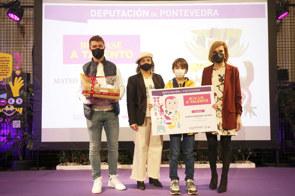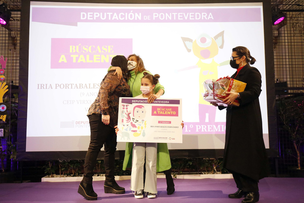 Iria Portabales, alumna de 9 anos do CEIP Virxe do Rocío (Vigo), alzouse esta mañá co primeiro premio do concurso para promover o xoguete igualitario da Deputación “Búscase a Talento”, no que acadaron tamén accésit Mateo Maqueira, 8 anos, e Goro Couso, 8 anos, dos CEIP Portonovo (Sanxenxo) e A Pedra (Bueu). O salón de plenos, “o noso lugar máis importante para acollervos a vós, que tamén sodes o máis importante que temos”, acolleu a entrega desta primeira convocatoria do certame na que a presidenta Carmela Silva acompañada da responsable de Red Talento, Laura Seara, enxalzou o papel dos centros educativos, “moi comprometidos coa educación integral”. A entrega foi seguida en directo no Salón de Plenos por ducias de compañeiras e compañeiros da nena e dos nenos premiados.