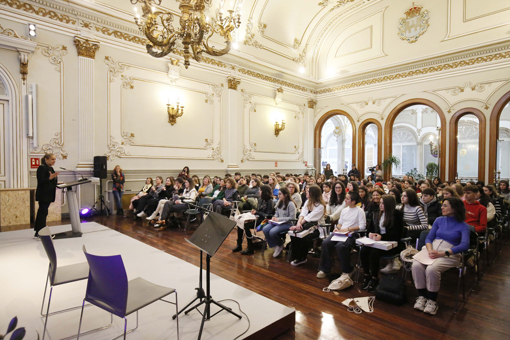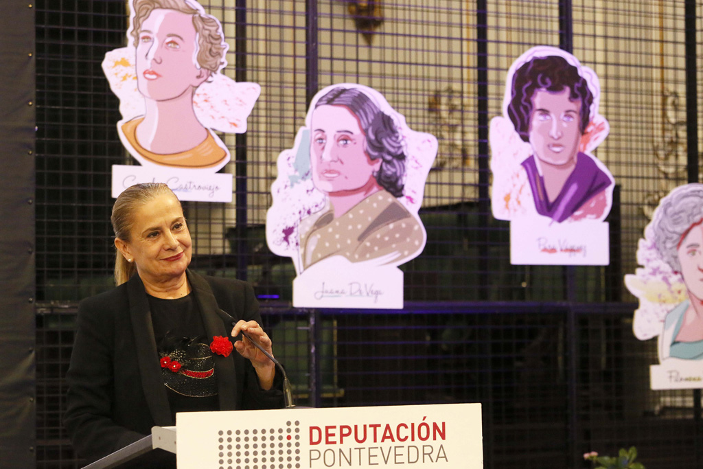 A presidenta da Deputación, Carmela Silva, amosouse “profundamente emocionada” pola calidade e o compromiso da mocidade e celebrou “o talento, neste caso destas cinco mulleres que amais de pensar moito e ben, escriben dunha forma tan fermosa, construíndo relatos a partir das letras que cada día escoitamos e cantamos e que están aí sen que nin sequera sexamos conscientes do pensamento e valores machistas que trasladan”. “Cancións que falan da submisión das mulleres, dun modelo único de moza que ten que ter unha estética determinada e una posición no mundo en subordinación. E estas mozas foron capaces de cambiar o conto”.  A presidenta agradeceu ao alumnado e ao profesorado presente o feito de “que a loita pola igualdade estea máis viva que nunca en vós e nos vosos centros educativos”. “É imprescindible –afirmou- que teñamos a igualdade como o centro da actuación educativa para construír sociedades mellores” porque “cando as mulleres avanzan, avanza o conxunto da sociedade e avanzan eles, porque tamén é intolerable pensar que os rapaces non teñen que ter sentimentos, non teñen dereito a ser coidadores e a outras moitas cuestións que lles están vetadas porque historicamente as tiveron que facer as mulleres”. Neste senso, agradeceu aos e ás docentes “ese traballo a veces silencioso e silenciado que é imprescindible e que ten inmenso valor para o ben común”.