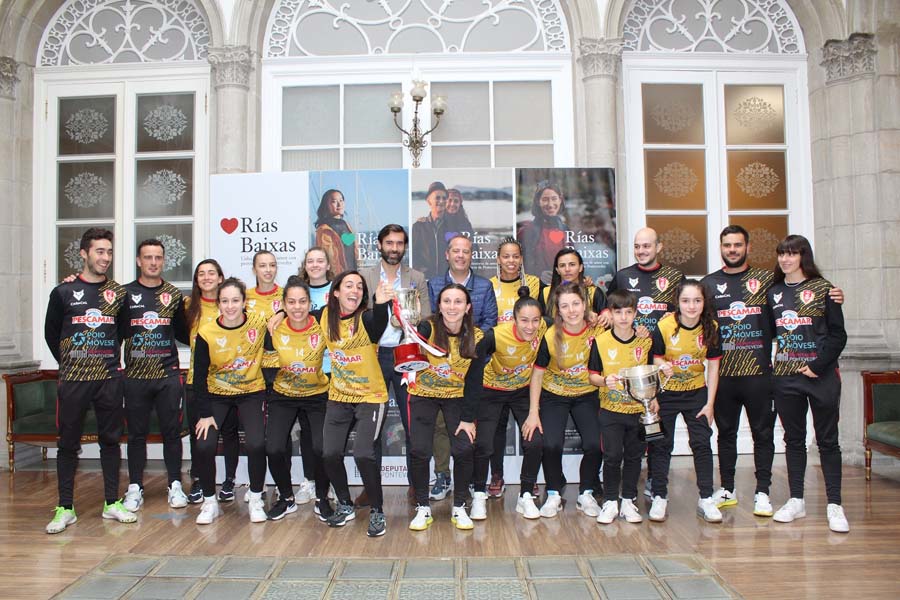 As xogadoras do Poio Pescamar de fútbol sala fixeron hoxe parada na Deputación Provincial, onde foron obxecto dunha recepción oficial tras proclamarse campioas da XV edición da Copa Galicia. O deputado de Deportes puxo en valor a importancia do apoio económico por parte das institucións e a visibilidade do deporte femenino porque “non ocupades o espazo que merecedes e nós temos que poñervos no foco”. Por outra banda, lembrou o compromiso da Deputación coa igualdade, “equiparando as axudas entre equipos masculinos e femininos” e a súa aposta pola formación de mulleres entrenadoras. Gómez tamén animou ás xogadoras, que están na loita por conseguir una plaza no “play off” polo título de Liga. O Poio Pescamar celebra, precisamente, este ano o seu 25º aniversario polo que mereceu os parabéns do deputado.