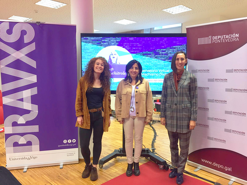 A Cátedra de Feminismos 4.0, impulsada pola Universidade de Vigo e a Deputación de Pontevedra, presentou hoxe o segundo informe do Observatorio Stop Machitroles (dispoñible na páxina web da Cátedra), que analiza a violencia machista dixital a través da prensa galega e que, entre os seus resultados, conclúe que o 63% das situación de acoso dixital procede de homes coñecidos da vítima. Participaron na presentación a deputada de Turismo e Xuventude, Ana Laura Iglesias, a directora da Unidade de Igualdade da UVigo e da Cátedra de Feminismos 4., Águeda Gómez, e a experta en ciberviolencias machistas Estíbaliz Linares Bahíllo.