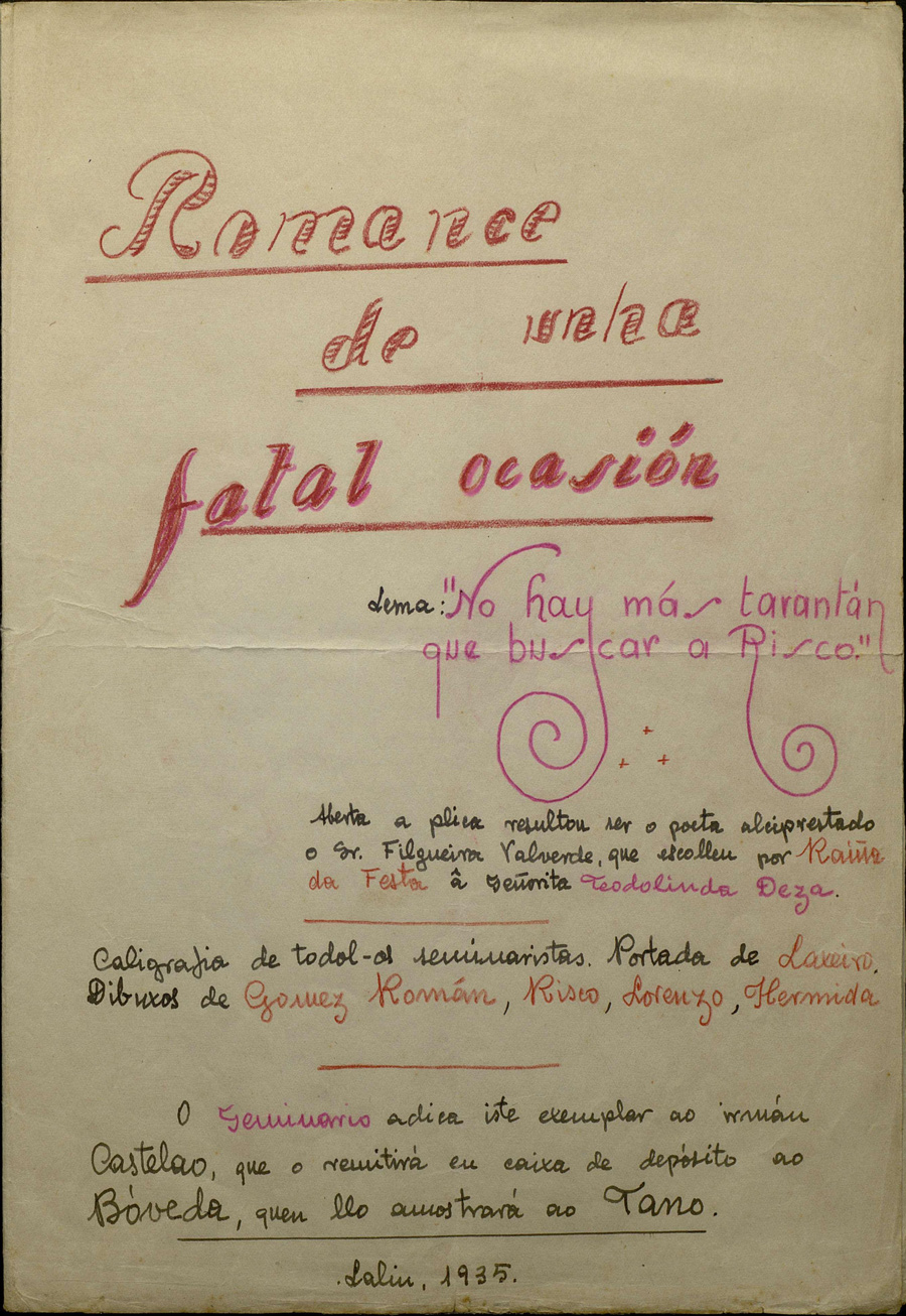 Nesta última campaña de investigación, desenvolvida a principios de xullo do 35, faltou Alfonso Daniel Rodríguez Castelao, que acababa de ser desterrado a Badajoz. Como xa fixeran noutras ocasións con textos dedicados a Vicente Risco e outros, os seminaristas dedicáronlle a Castelao o Romance de unha fatal ocasión, un exercicio literario con caligrafías e ilustracións de varios deles. Aínda que o de Rianxo era o destinatario principal do poema, a dedicatoria faise extensiva a outros ausentes: Alexandre Bóveda, tamén castigado en Cádiz, e Robustiano Fernández Cochón. O manuscrito orixinal gárdase no Arquivo Filgueira Valverde do arquivo documental do Museo.